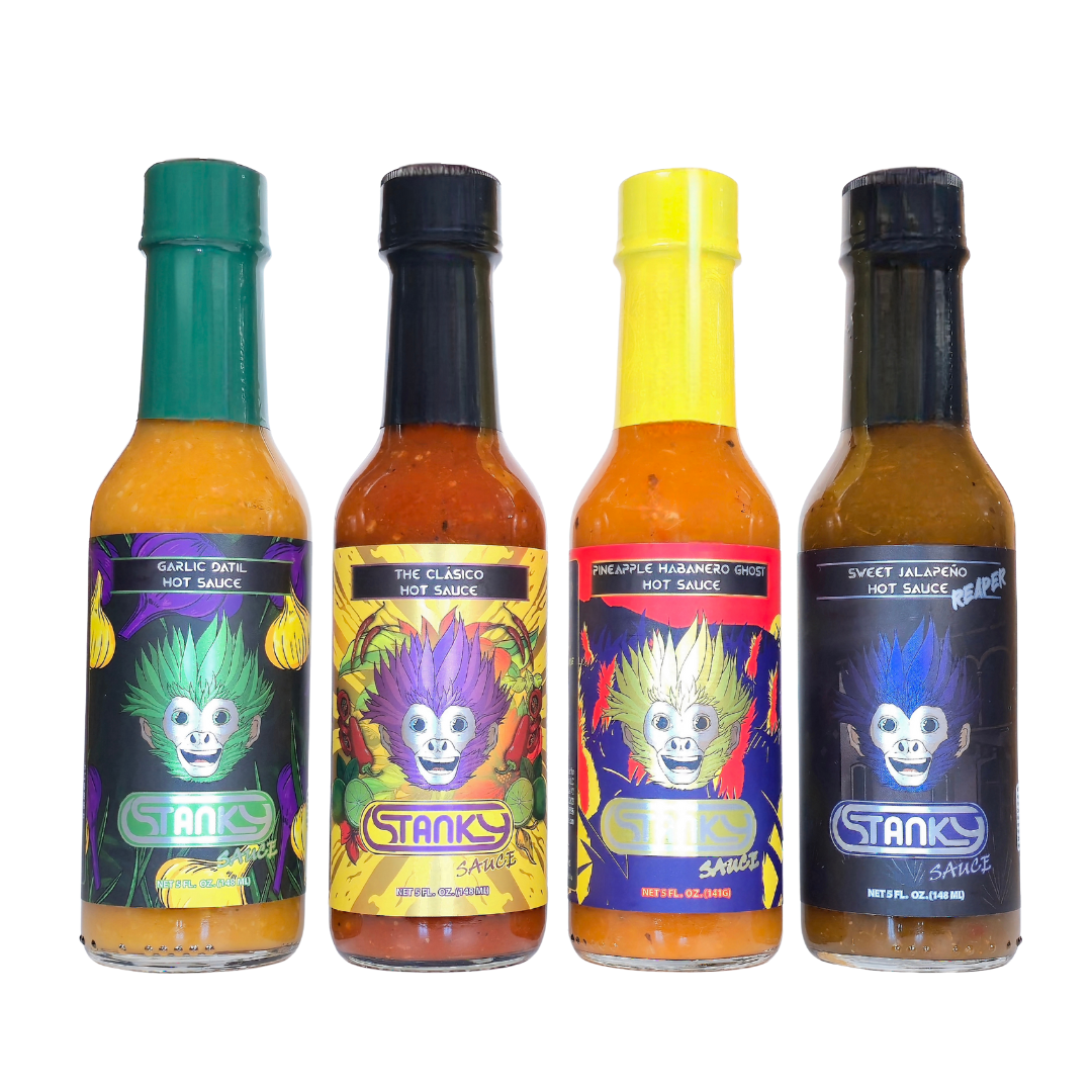 Take your taste buds on a bold journey with the Stanky Sauce Adventure 4-Pack. This hot sauce gift set brings together four of our most popular flavors, each crafted in Florida with all-natural ingredients and award-winning recipes. From smoky to sweet, tangy to fiery, this collection has something for every spice lover.